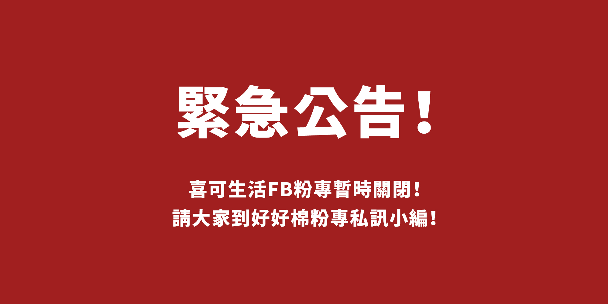 因FB系統問題 喜可生活粉專暫時關閉 請大家到好好棉粉專私訊小編