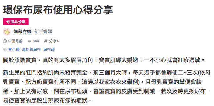 直到參加婦幼展,看到喜可環保布尿布的介紹,心想「何不讓衣衣試用看看」,台灣的紡織能力有目共睹,也許這款環保布尿布會較為透氣舒適,更適合有尿布疹的衣衣。
