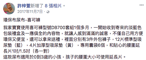 我家寶寶使用喜可褲型號DB700套組1個多月,一開始收到寄來的淡藍色包裝禮盒及一應俱全的內容物,就讓人感到滿滿的誠意,不僅自己用方便環保又便宜,還可以拿來送禮。