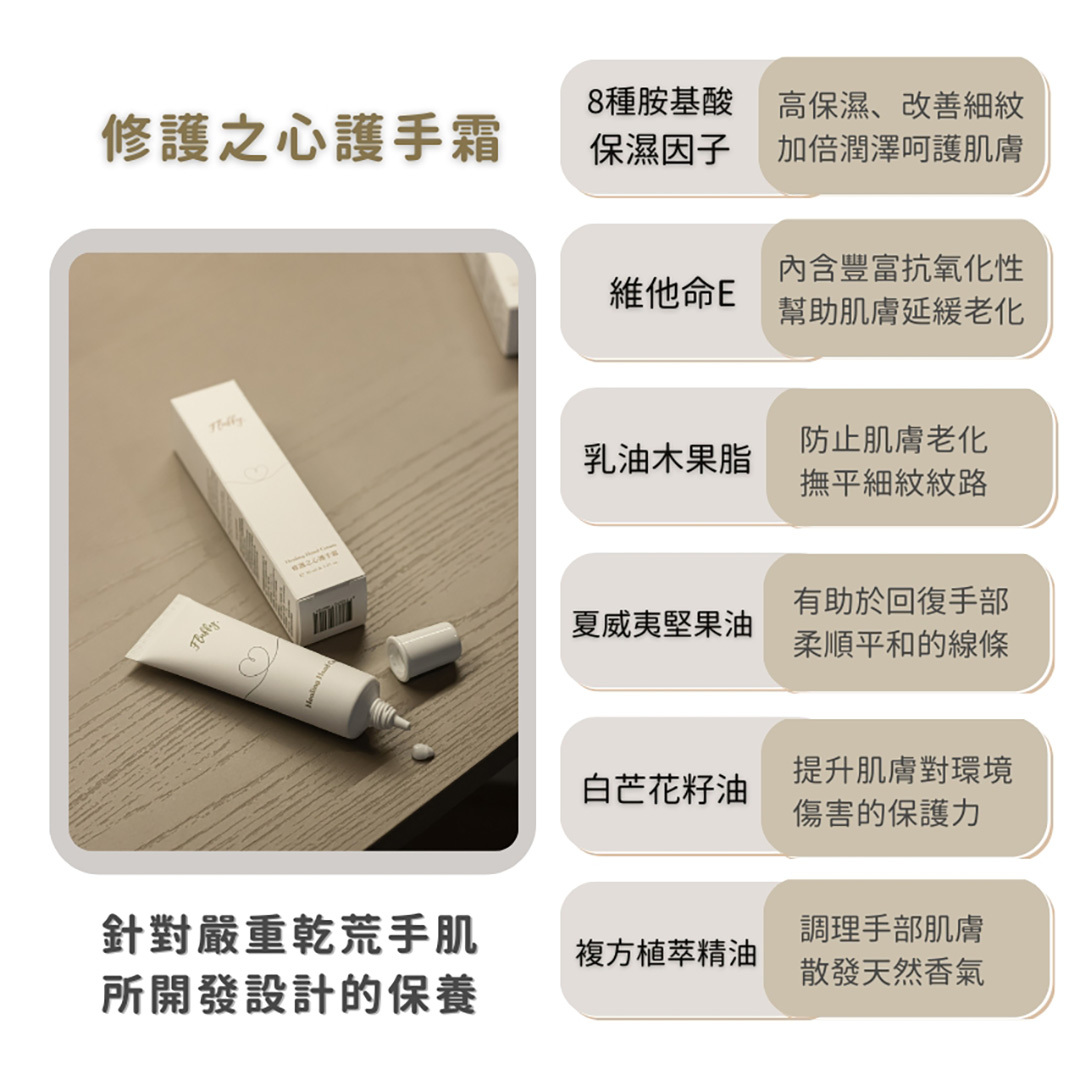 添加八種胺基酸保濕因子、有機乳油木果脂與夏威夷堅果油,深層修護、改善細紋,預防乾裂脫屑。