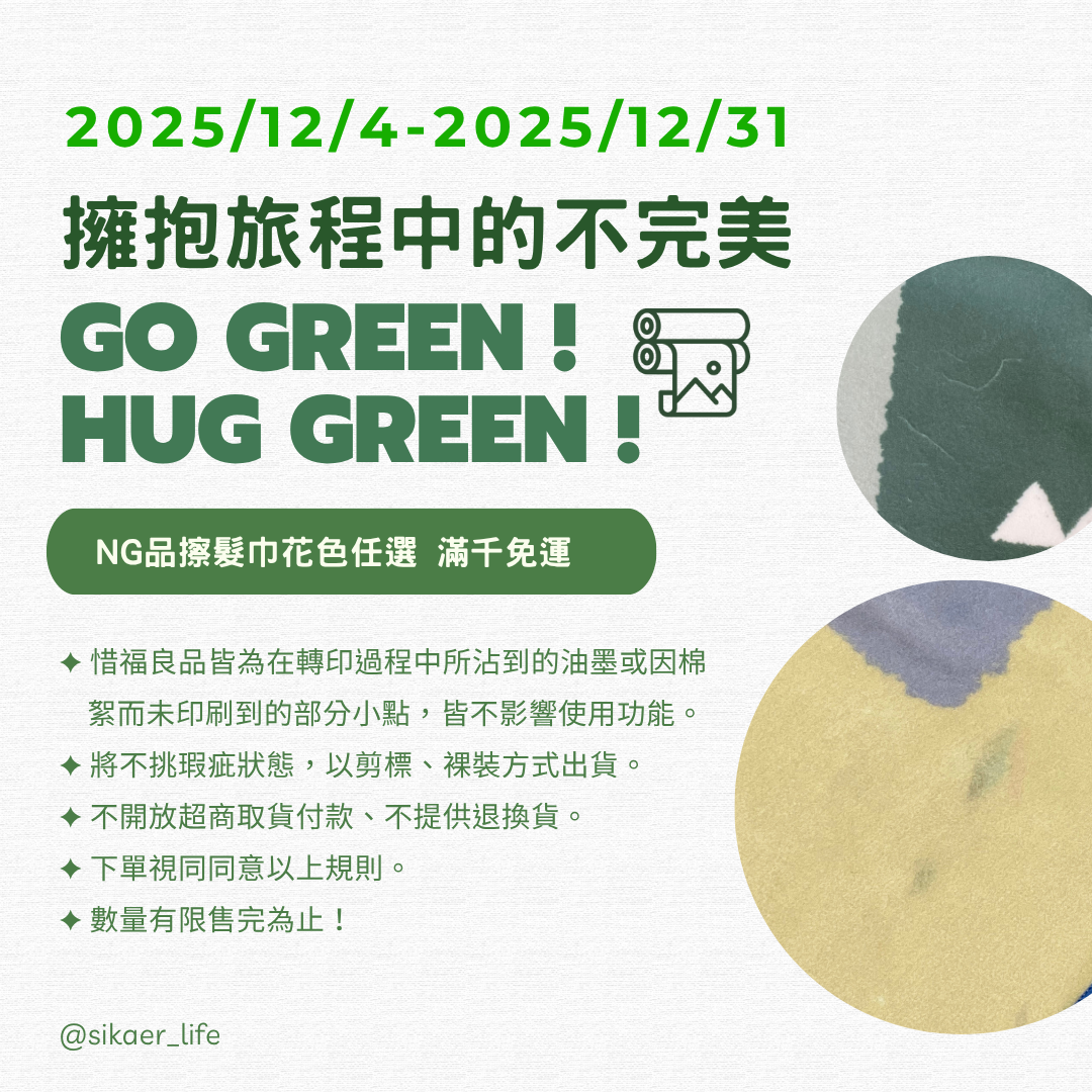▍惜福良品皆為擦髮巾印刷過程中,因沾到油墨或因附著的棉絮而產生的印刷不完美,絕非破損哦,且皆不影響使用功能。